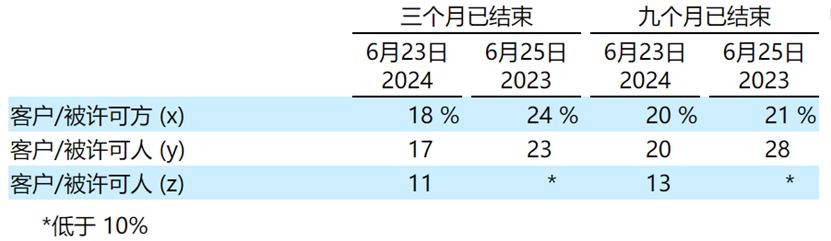 苹果对高通的营收有多重要?高通2023年财报中的风险提示篇中明确表示,前两大客户苹果、三星均占其收入的10%以上。在2024Q3财报中则列出,前三大客户X、Y、Z分别占当季营收的18%、17%和11%,占前三季营收的20%、20%和13%。