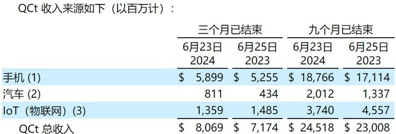 其实高通也早就看到了汽车将成为最大智能终端的这一趋势,并在数字座舱和高级辅助驾驶(ADAS)芯片上进行投入。虽然这块业务的增速不低,但目前从财报来看,营收规模还很小。2024年Q3,其汽车业务收入只有8.11亿美元,占总收入的比重只有8.6%。
