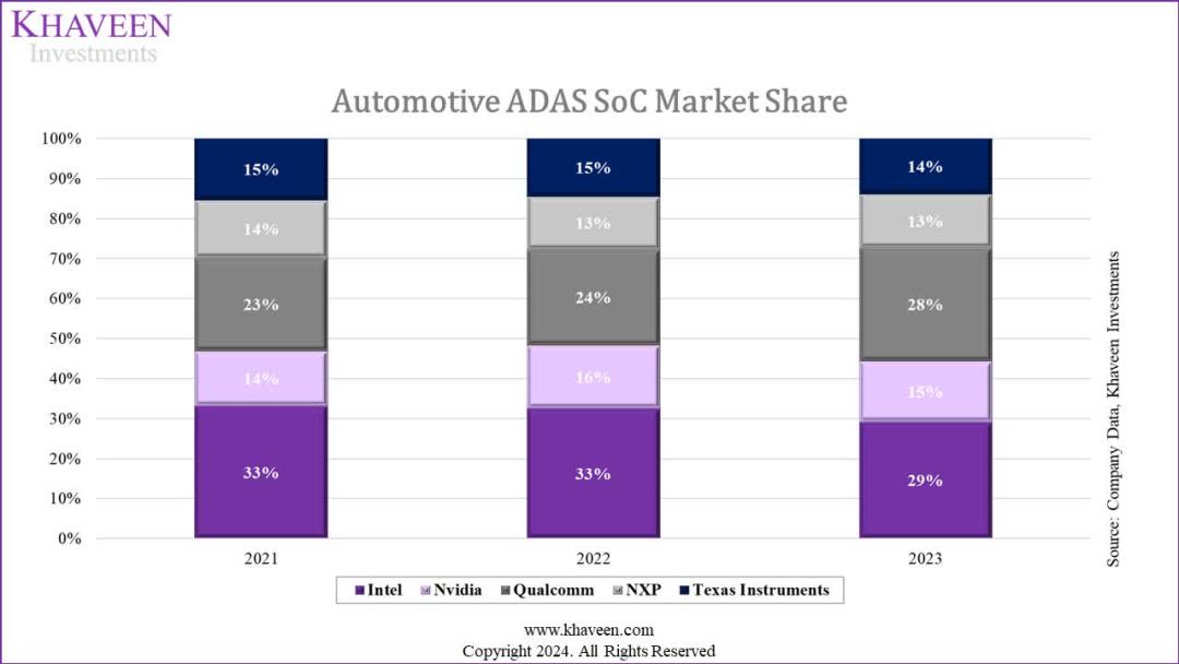 2、Moblieye。高通的汽车业务多年来保持高增长,根据Khaveen Investments的分析,从2020-2023年,高通汽车芯片的平均增速达到29.9%,超过了英特尔 Mobileye的 24.9%,英伟达的15.3%。