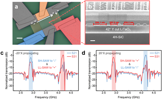 制备的超小型频分器光镜图如图3a所示,器件基础功能能够在一个谐振器的面积能实现。在发射和接收换能器的边界处进行FIB观察,可以清晰地观察到不同端口的电极设计区别(图3b)。端口匹配后的器件测试结果如图3c和d所示,在SH SAW和LL SAW频段均实现了10dB以上的传输比。后续通过进一步优化发射端口和接收端口的响应频率,我们成功将两个频段的传输比提升到了15dB以上。