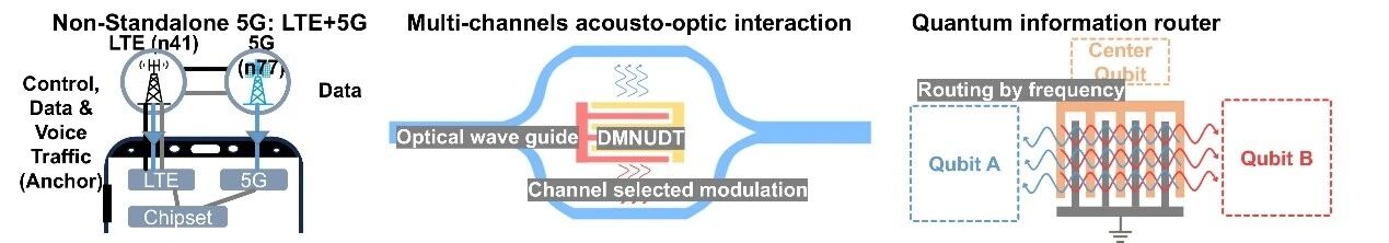 SAW器件常见的设计构型与对应的换能器设计如图4,DMNUDT独特的声波发射特性给声表面波器件的功能设计提供了一个全新的维度,打破了器件制成后,声子的发射方向无法调整的问题。DMNUDT发射方向随频率可调的特性有着诸多应用场景(见图5),基于此提出的极简频率分束器可以作为一种片上集成的“路由器”,在5G/6G通信中的载波聚合(Carrier Aggregation)、非独立组网模式以及未来的紧凑型射频前端模块中具有广阔的应用前景。举个例子,LL SAW的工作频率接近SH SAW的1.5倍,因此,目前的频分器可以很好地适配4G n41(2496-2690 MHz)和5G n77(3300-4200 MHz)频段的协同工作。此外,利用DMNUDT信息可以通过编码进不同频率实现路径选择,声光调制方面可能可以通过DMNUDT对MZI的两个支路进行分别/同时的调制;量子器件方面,频率绑定的传输方向也让量子比特之间的信息传输有更多的设计空间。