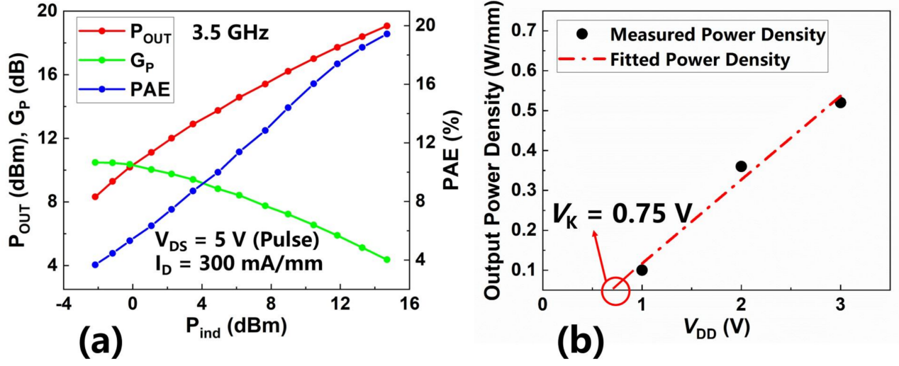 在3.5 GHz频段的负载牵引测试中,器件在5 V漏极电压下输出功率密度达0.81 W/mm,线性增益10.5 dB,峰值功率附加效率(PAE)为19.4%。尤为值得关注的是,在射频功率应用场景下,通过线性外推法提取得到器件的膝点电压仅0.75 V,是目前已公开报道的低压GaN射频器件中的最优值。下一步将通过选区生长高阻GaN、抬升T栅等方面的研究,进一步提升器件性能。