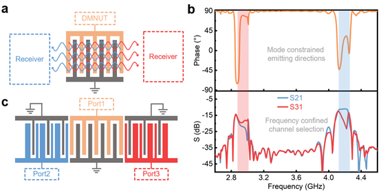 图2 基于DMNUDT的分频器设计 a)频分器概念图,利用DMNUDT将频率信号在空间中分离实现频分器;b)频分器仿真响应图;c)频分器结构图,通过SPUDT实现换能器换能方向的反转