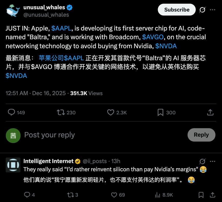 芯东西12月16日消息,今日凌晨,美国金融数据分析平台unusual whales在社交平台X上发文称,苹果正在开发首款代号为“Baltra”的AI服务器芯片,并与博通合作开发关键网络技术,以避免从英伟达购买芯片。该账号还特别提到,苹果“宁愿重新发明芯片,也不愿为英伟达的高额利润买单”。外媒WccfTech推测,苹果Baltra是为满足AI推理需求而生,2027年亮相。