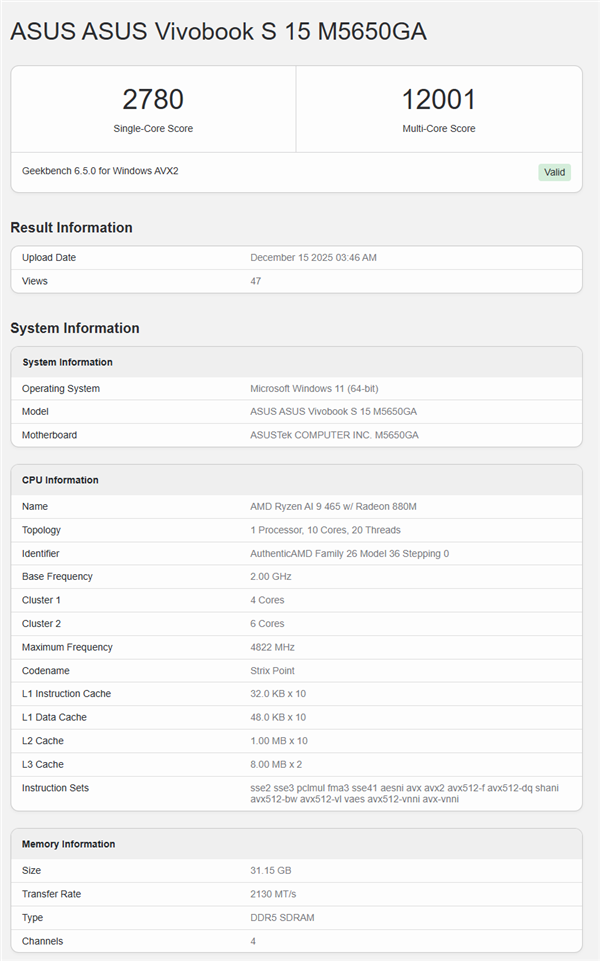 根据测试数据,锐龙AI 9 465在Geekbench 6中取得了单核2780分、多核12001分的成绩,这一表现与现有的锐龙AI 9 365(Strix Point)基本处于同一水平。