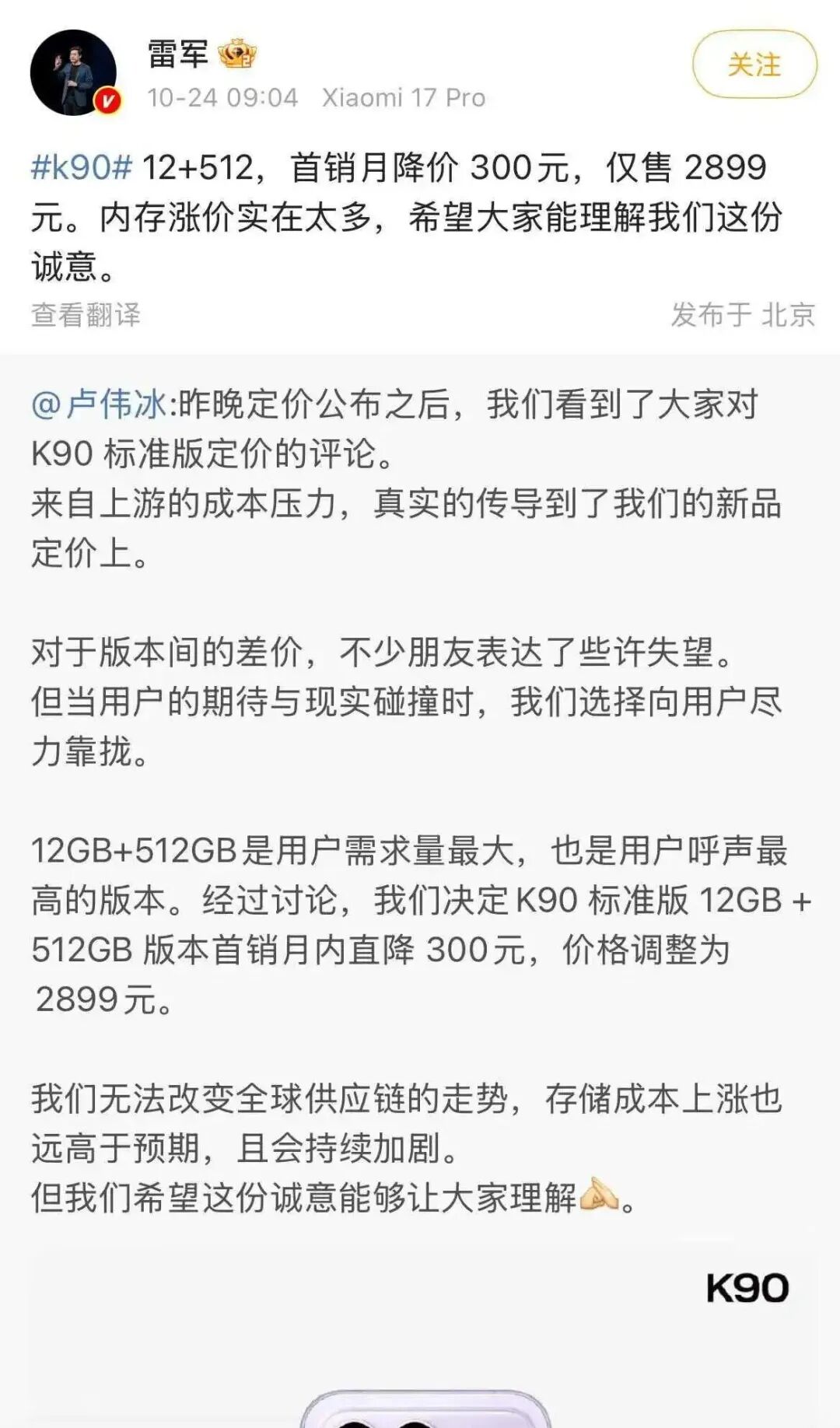 最终小米集团董事长雷军、总裁卢伟冰不得不出面回应,在解释“内存涨价实在太多”之余,以制定首月优惠的方式平息争议。