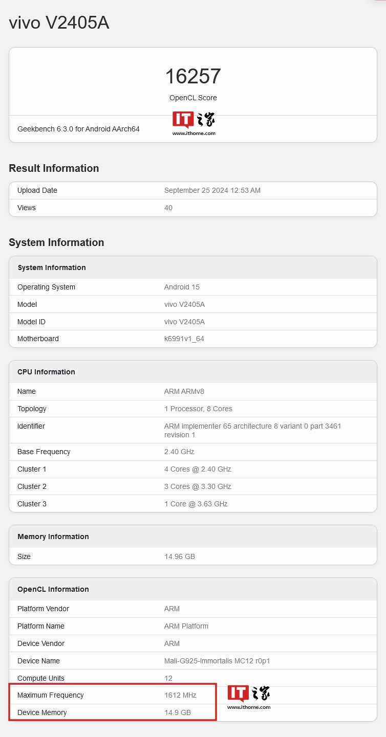 IT之家 9 月 27 日消息,科技媒体 innogyan 今天(9 月 27 日)发布博文,报道称在 GeekBench 平台发现了 vivo V2405A 手机,搭载联发科天玑 9400 芯片,OpenCL 跑分为 16257 分。