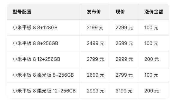 比如前几天小米的小米平板 8、8 Pro,以及 REDMI Pad 2,都已经悄咪咪调了价,涨价幅度在 100~200 元的区间。