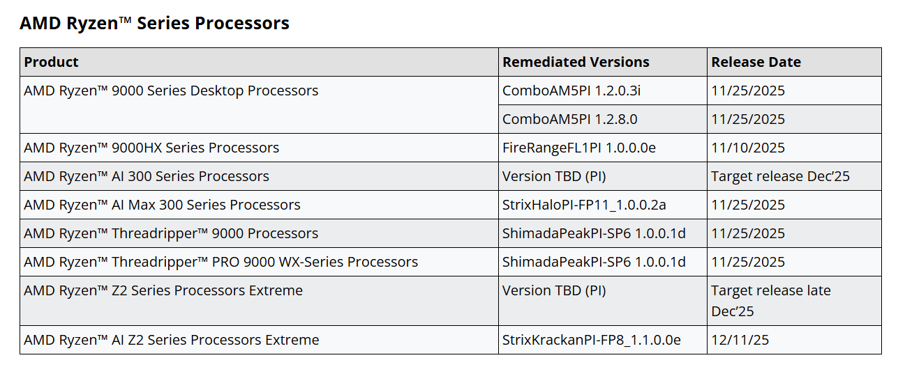 除了 AMD 锐龙 Z2 系列 Extreme 处理器预计要等到 12 月 25 日晚些时候才能发布补丁之外,其余型号均已陆续获得修复(提供给 OEM 厂商),但部分嵌入式型号产品的补丁发布计划延至 2026 年初(目标 1 月 26 日)。