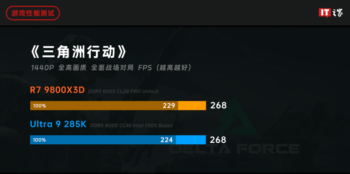 可如果你不是“瓦学弟”,而是一名“干员”,那么无论是选择锐龙 7 9800X3D 处理器还是酷睿 Ultra 9 285K 处理器,在《三角洲行动》这款游戏中的性能差距完全可以忽略,即便锐龙 7 9800X3D 处理器的 1% Low 高出 8 帧,在实际游戏体验上两者很难分出差别。