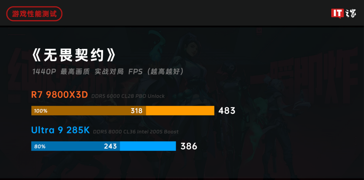 由于《无畏契约》这个游戏几乎只吃 CPU 性能,因此性能瓶颈都在 CPU 上。1080P 分辨率下锐龙 7 9800X3D 在激烈对战中跑到了接近 500 帧的水平,显然远没有训练靶场内动辄千帧以上的夸张表现,但相比酷睿 Ultra 9 285K 依然有着 25% 的平均帧数差距,1% Low 帧的差距也达到了 30%。