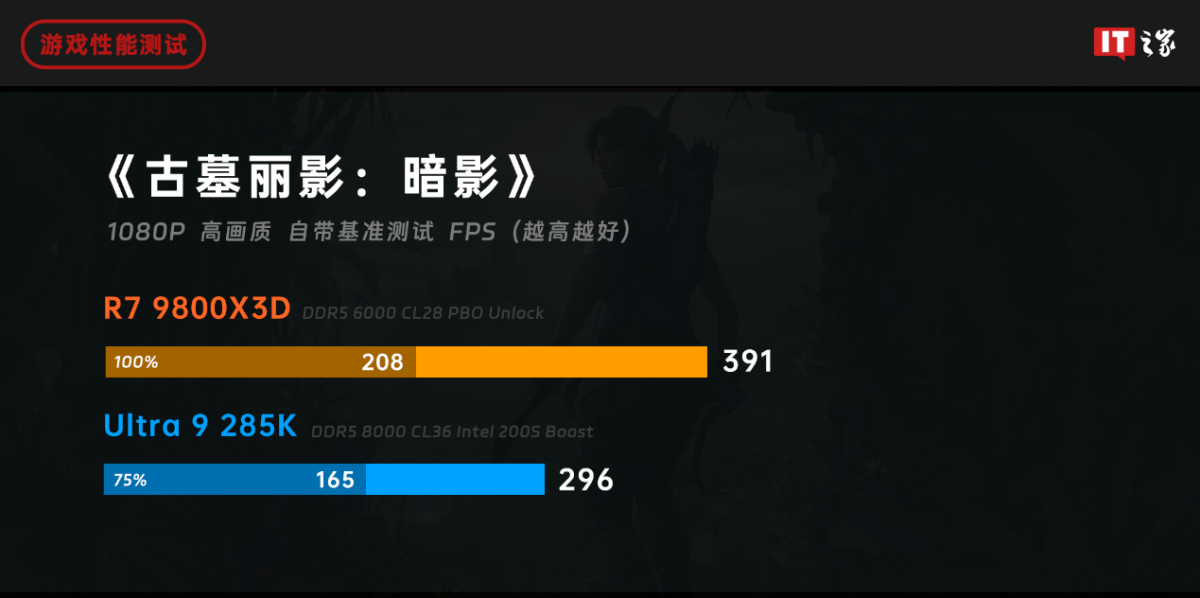 《古墓丽影:暗影》这样经典的 RPG 游戏,依旧是属于 AMD 的主场。在 1080P 分辨率下,锐龙 7 9800X3D 的游戏平均帧数领先了酷睿 Ultra 9 285K 32%,1% Low 领先了酷睿 Ultra 9 285K 26%。