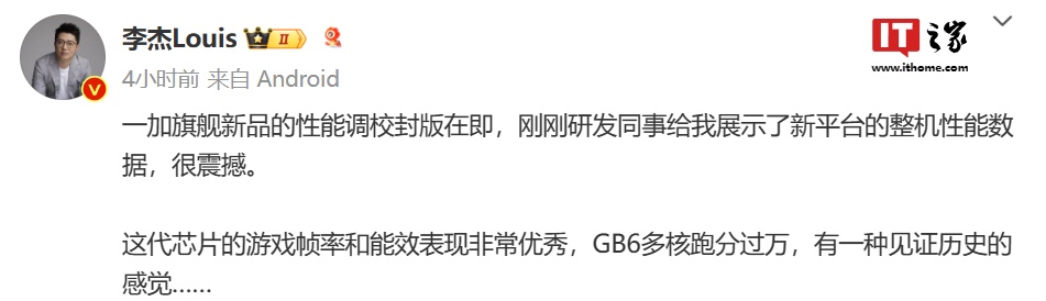 李杰表示:“这代芯片的游戏帧率和能效表现非常优秀,GB6 多核跑分过万,有一种见证历史的感觉……”
