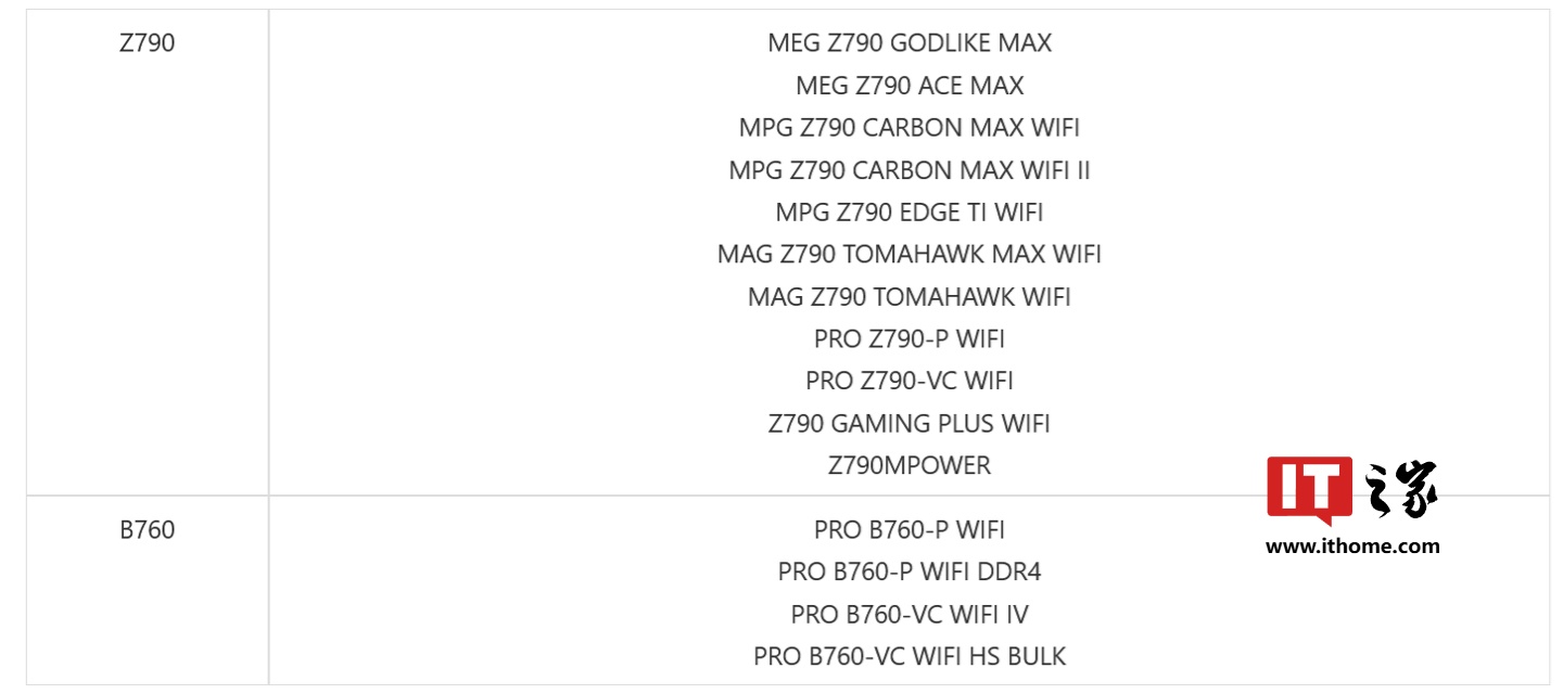 微星的首批含 0x12B 微代码 BIOS 更新面向 11 款 Z790 和 4 款 B760 主板推出,未来将扩展到包括初代 Z790 旗舰主板 MEG Z790 GODLIKE 在内的其它英特尔 700、600 系主板上。