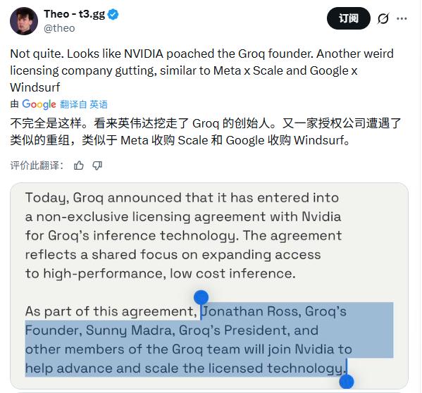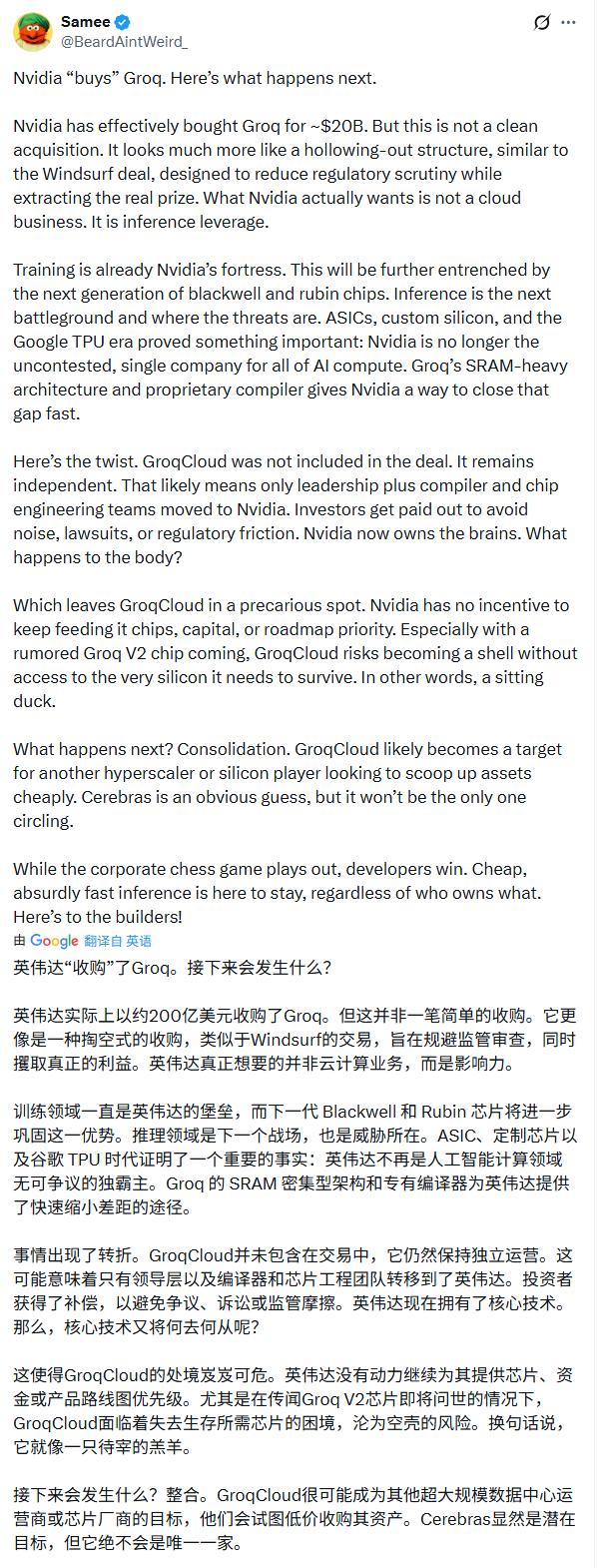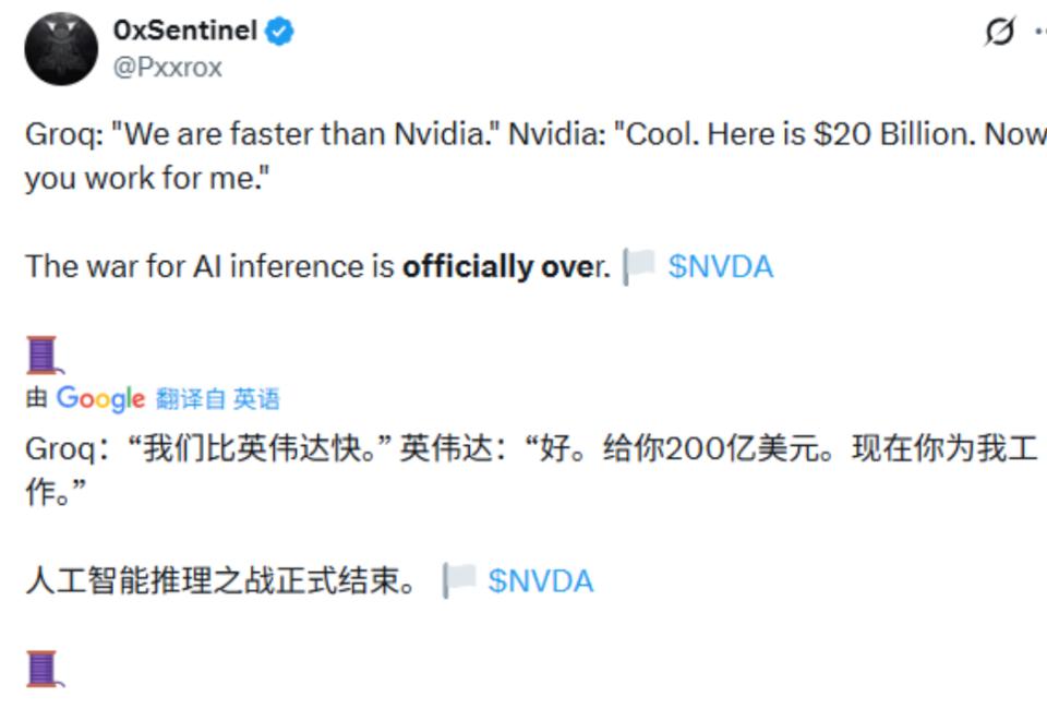 正如社交媒体上网友的调侃话语中所形容的那样,这更像是一句来自英伟达的“直白邀请”:“你们(指Groq)技术很不错,200亿美元,带着你的团队和架构,一起过来为英伟达工作吧。”
