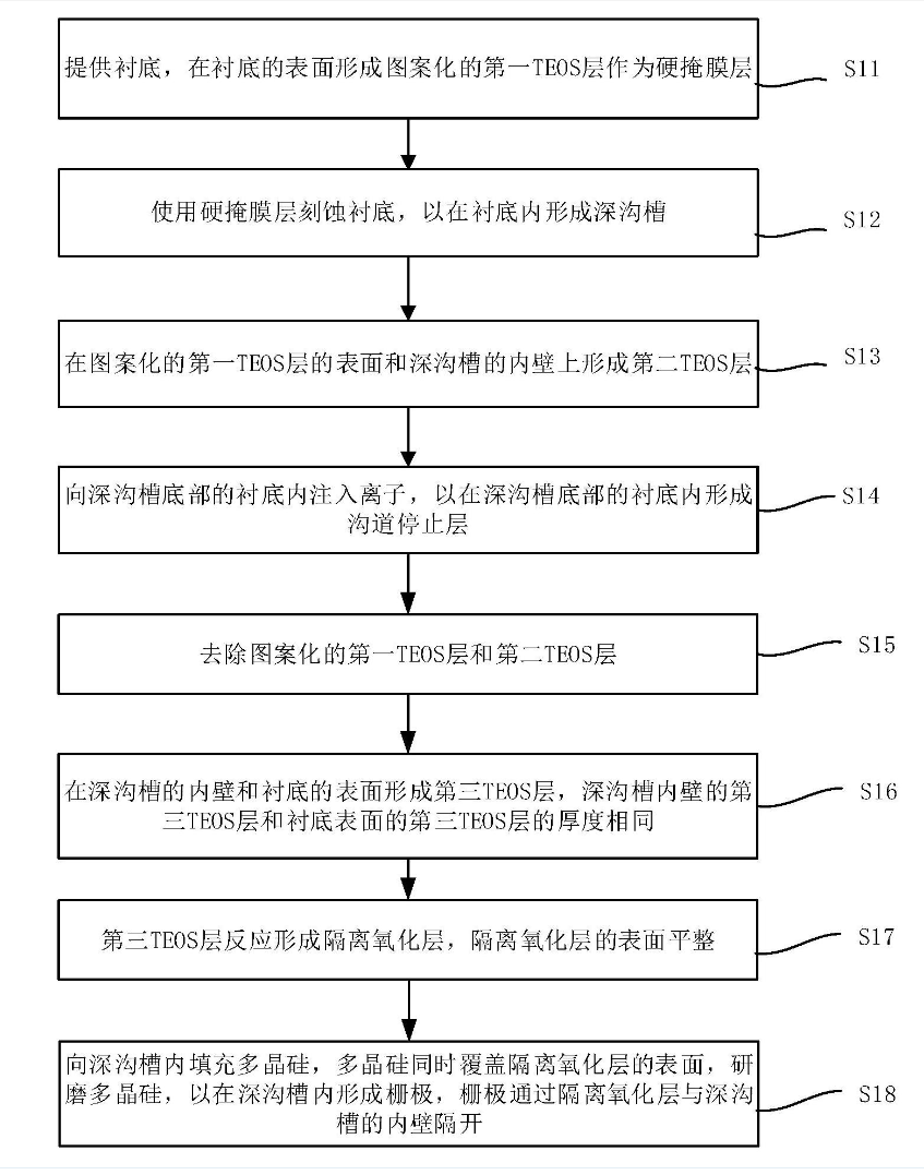 本发明提供了一种半导体器件的形成方法,包括:在衬底的表面形成图案化的第一TEOS层作为硬掩膜层;使用硬掩膜层刻蚀衬底,以形成深沟槽;在图案化的第一TEOS层的表面和深沟槽的内壁上形成第二TEOS层;向深沟槽底部的衬底内注入离子,以形成沟道停止层;去除图案化的第一TEOS层和第二TEOS层;在深沟槽的内壁和衬底的表面形成第三TEOS层,深沟槽内壁的第三TEOS层和衬底表面的第三TEOS层的厚度相同;第三TEOS层反应形成隔离氧化层,隔离氧化层的表面平整;向深沟槽内填充多晶硅,多晶硅同时覆盖隔离氧化层的表面,研磨多晶硅,以在深沟槽内形成栅极。本发明减少了多晶硅的残留。
