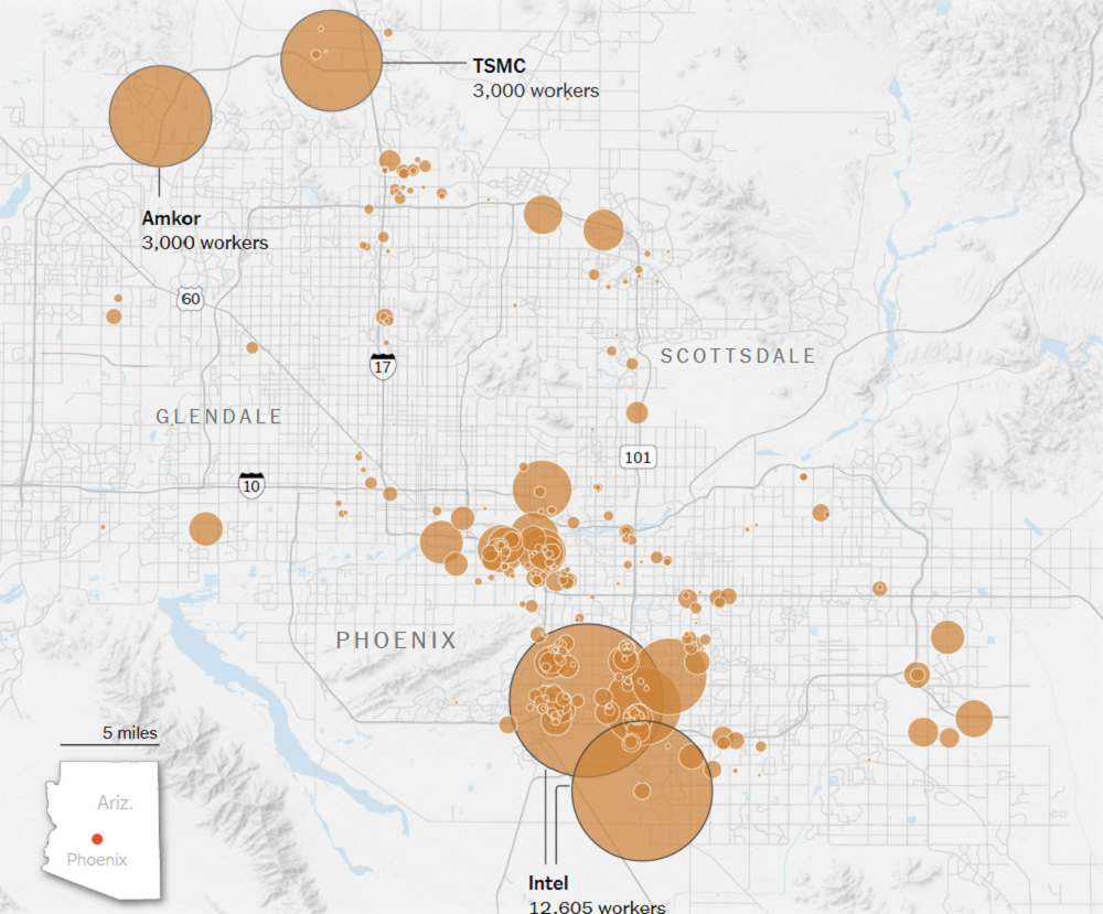 ▲凤凰城大都会区芯片工厂分布(图源:《纽约时报》)
