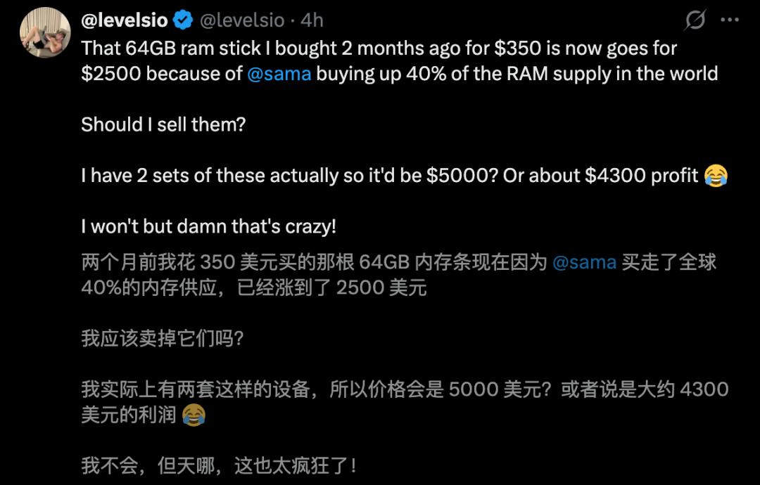 就是因为有消息说,奥特曼买走了全球40%的内存供应......