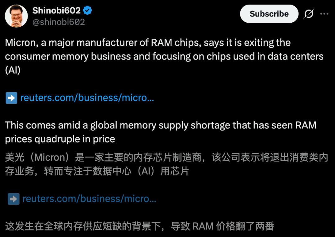 12月初,美光已宣称,将退出消费类内存业务——Crucial,转而专注于数据中心AI芯片。