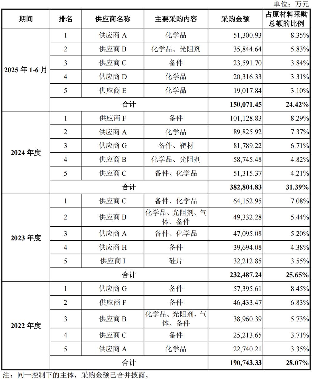 2022年、2023年、2024年、2025年1-6月,兆易创新向前五大原材料供应商采购金额占当期采购总额的比例分别为28.07%、25.65%、31.39%、24.42%。