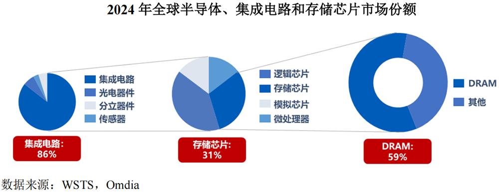 根据WSTS、Omdia数据,DRAM是当前市场规模最大的存储芯片。2024年,全球DRAM市场规模为976亿美元,占存储芯片市场规模的比例约为59%。