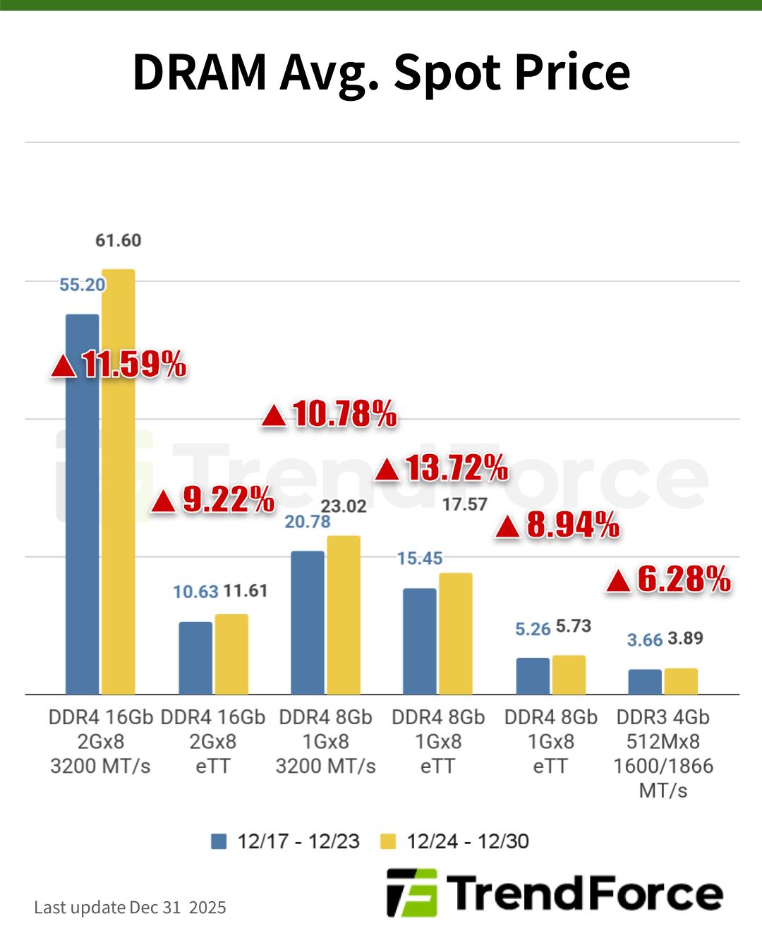 数据显示,主流芯片(DDR4 1Gx8 3200MT/s)的现货均价已从 12 月 24 日当周的 22.235 美元,强势上涨 6.80% 至 12 月 30 日当周的 23.746 美元。