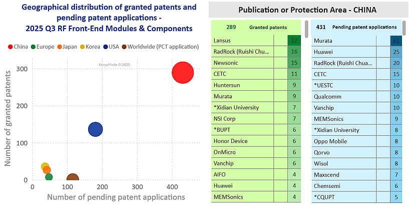 专利竞争成为关键战场。2025年全球射频前端专利申请量同比增长35%,其中中国企业申请量占比达42%,较上年提升8个百分点。今年三季度,飞骧科技首次登上国内排名榜首,领先于新授权专利(22项),其次是锐石创新( RadRock)、新声科技和 CETC。这五家公司共同占据了本季度新专利家族和新授权专利家族的最大份额。更重要的是,中国企业正越来越多地将知识产权保护扩展到国内边界之外,华为、新声科技和飞骧科技通过美国和PCT途径构建具有全球影响力的专利组合,在国际专利诉讼中的胜率持续提升,从"被动防御"转向"主动布局",为全球化发展奠定基础。