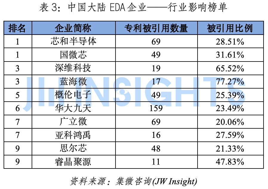 行业影响榜单TOP10中,上榜企业的专利被引用比例均超过20%。其中芯和半导体和国微芯并列榜单第一,其中芯和半导体的专利被引用数量和被引用占比在今年显著增加。
