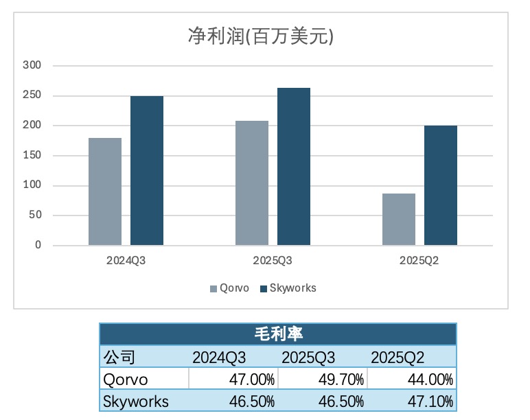 二者合并后的新公司以77亿美元年营收、27%全球市场份额登顶行业,超越博通(16%)成为全球最大射频前端供应商。从前三季度财务数据来看,双方合并具备极强的互补性:Skyworks 2025财年第四季度(自然年Q3)营收11亿美元,净利润2.64亿美元,盈利能力持续领跑;Qorvo同期营收10.59亿美元,净利润2.08亿美元,但毛利率升至49.7%,显著高于Skyworks的46.5%,为合并后盈利优化奠定基础。研发投入方面,双方2025财年研发支出合计达15亿美元(GAAP口径),其中Skyworks从6.32亿美元增至7.86亿美元,Qorvo从6.82亿美元提升至7.48亿美元,巨额研发投入将聚焦GaN、BAW等核心技术迭代,巩固高端市场壁垒。