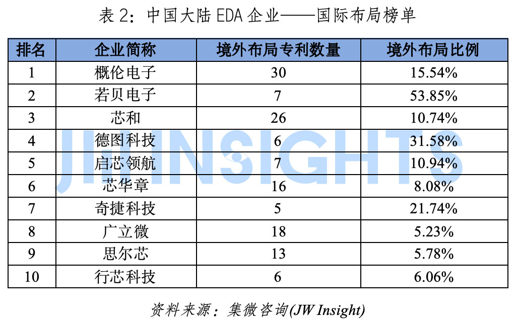 国际视野十强榜单中,仅有概伦电子和芯和表现较为突出,其中概伦电子共布局30件境外专利,相比去年增加11件,芯和共布局26件专利,相比去年增加13件,且两家的境外布局占比均有提升。