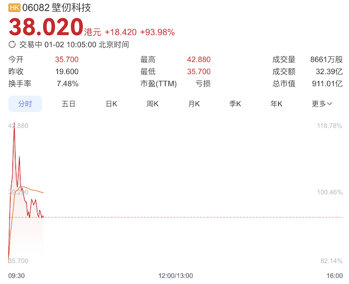 截止发稿,壁仞科技股价上涨93.98%,市值为911亿港元。