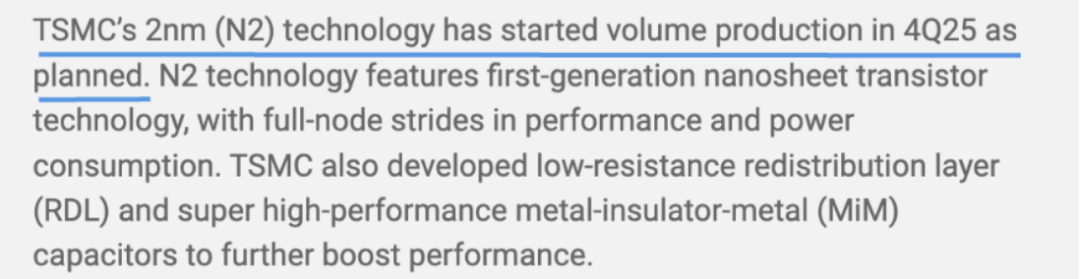台积电2nm(N2)技术已按计划于2025年第四季度投入量产。