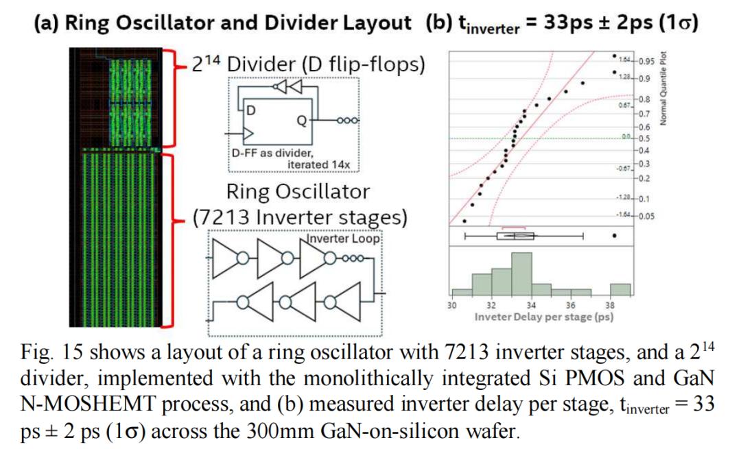 图 15 显示了采用相同单片工艺实现的环形振荡器布局,该振荡器包含 7213 级反相器和一个 214 分频器(由 D 触发器链组成)。在 300 mm GaN-on-Si 晶圆上,每级反相器的测量延迟为 33 ps ± 2 ps (1σ)。这是首次采用 300 mm 单片集成 GaN N-MOSHEMT 和 Si PMOS 工艺,展示了一个功能齐全的片上集成数字电路库。