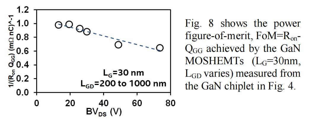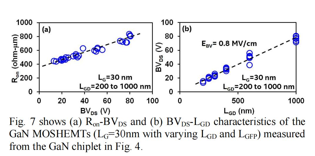 图 7 显示了不同 LGD 和 LGFP 的 LG=30nm GaN MOSHEMT 的 Ron-BVDS 和 BVDS-LGD 特性,测量自图 4 中的 GaN Chiplet。