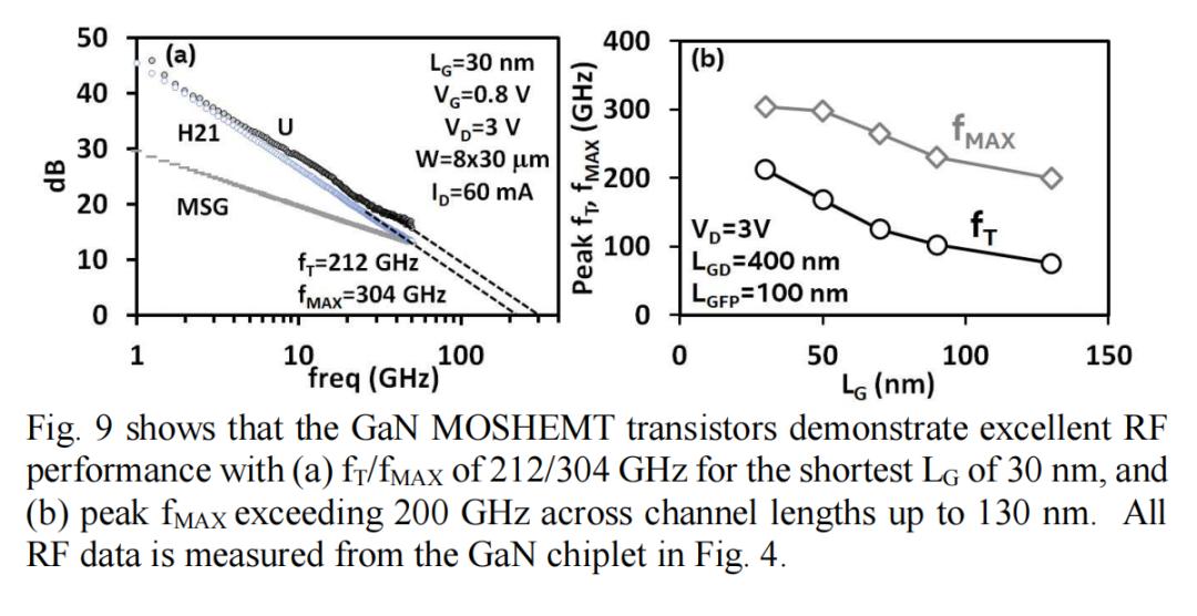 图 9 展示了 GaN MOSHEMT 晶体管的射频性能。对于最短的 LG 为 30 nm,实现了 212/304 GHz 的高 fT/fMAX 值;在 LG 长达 130 nm 的范围内,峰值 fMAX 均大于 200 GHz。此处测得的射频数据(基于图 4 中的 GaN Chiplet)表明,该器件在射频和高速应用(例如光子学)方面具有良好的应用前景。这种 GaN Chiplet技术在这些应用中具有潜在的应用价值。