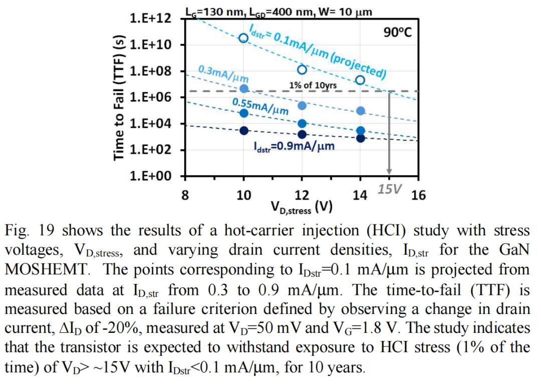 图 19 显示了 GaN MOSHEMT 在不同应力电压 VD,stress 和不同漏极电流密度 ID,str 下的热载流子注入 (HCI) 研究结果。对应于 ID,str=0.1 mA/µm 的点是从 ID,str 从 0.3 到 0.9 mA/µm 的测量数据中投影得到的。失效时间 (TTF) 的测量基于失效准则,该准则通过观察漏极电流变化 ∆ID 达到 -20% 来定义。
