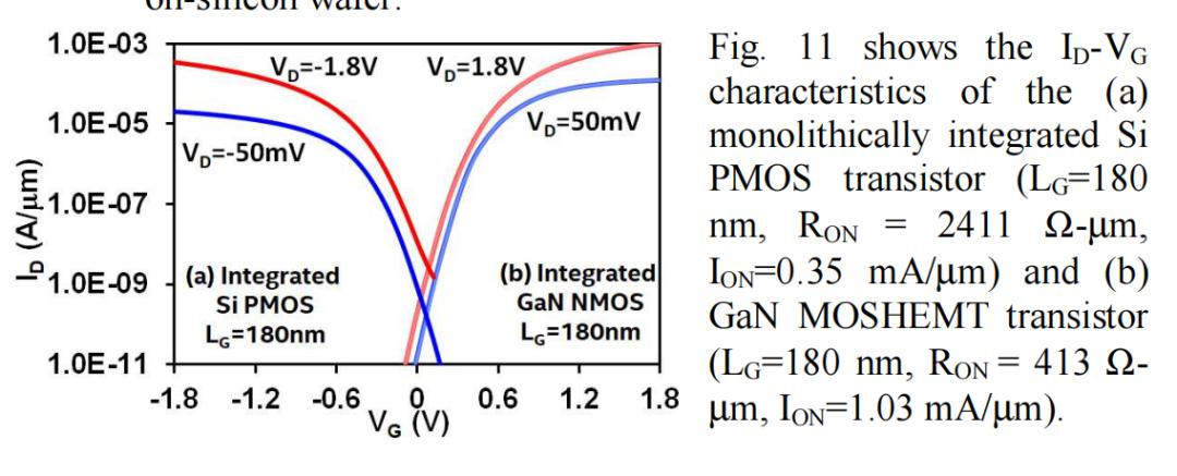 图11为单片集成Si PMOS晶体管(LG=180 nm,RON=2411 Ω-µm,ION=0.35 mA/µm)和GaN MOSHEMT晶体管(LG=180 nm,RON=413 Ω-µm,ION=1.03 mA/µm)的ID-VG特性曲线。
