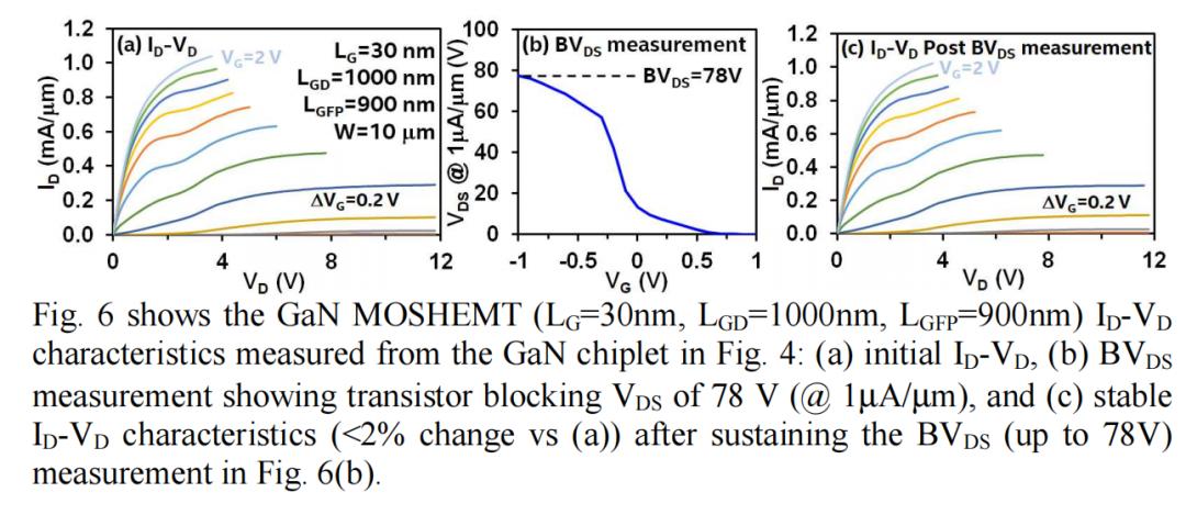 图 6 展示了从图 4 中的 GaN Chiplet测得的 GaN MOSHEMT(LG=30 nm,LGD=1000 nm,LGFP=900 nm)的 ID-VD 特性。在图 6(b) 的 BVDS 测量过程中,在维持 78 V (@ 1 µA/µm) 的 VDS 后,该晶体管表现出稳定的 ID-VD 特性(变化小于 2%)。