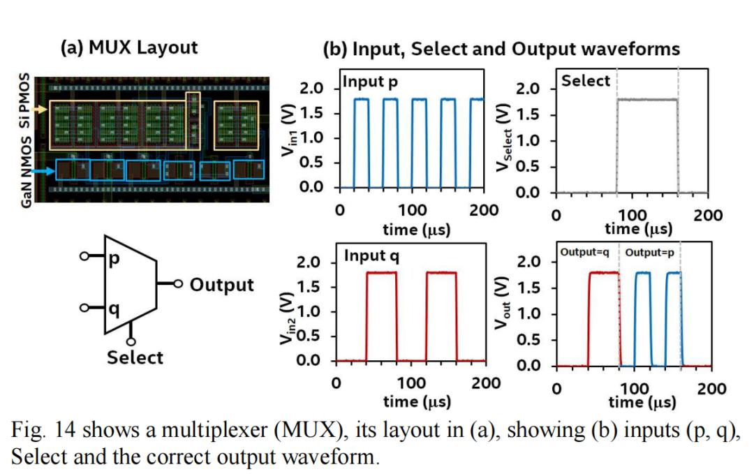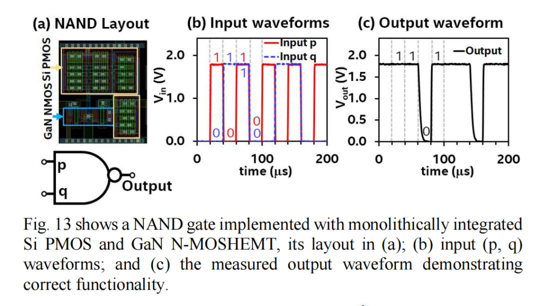 图12为采用单片集成GaN N-MOSHEMT和Si PMOS实现的反相器,展示了测得的反相器Vout-Vin响应以及输入/输出波形。