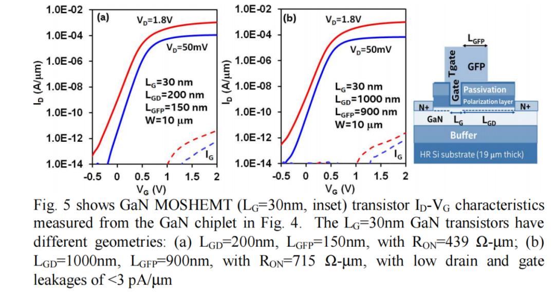 图 5 展示了从图 4 中的 GaN Chiplet测得的 GaN MOSHEMT(LG=30 nm,栅漏间距不同)晶体管的 ID-VG 特性。LG=30 nm 的 GaN 晶体管表现出优异的导通电阻 (RON),以及低于 3 pA/µm 的低漏极和栅极漏电流。
