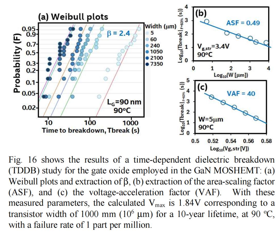 第三,GaN MOSHEMT晶体管技术必须满足基本的可靠性要求。在这项工作中,我们展示了温度相关介质击穿(TDDB)、正偏压温度稳定性(pBTI)、高温反向偏压(HTRB)和热载流子注入(HCI)方面的良好结果,这表明300mm GaN MOSHEMT技术能够满足这些可靠性指标。