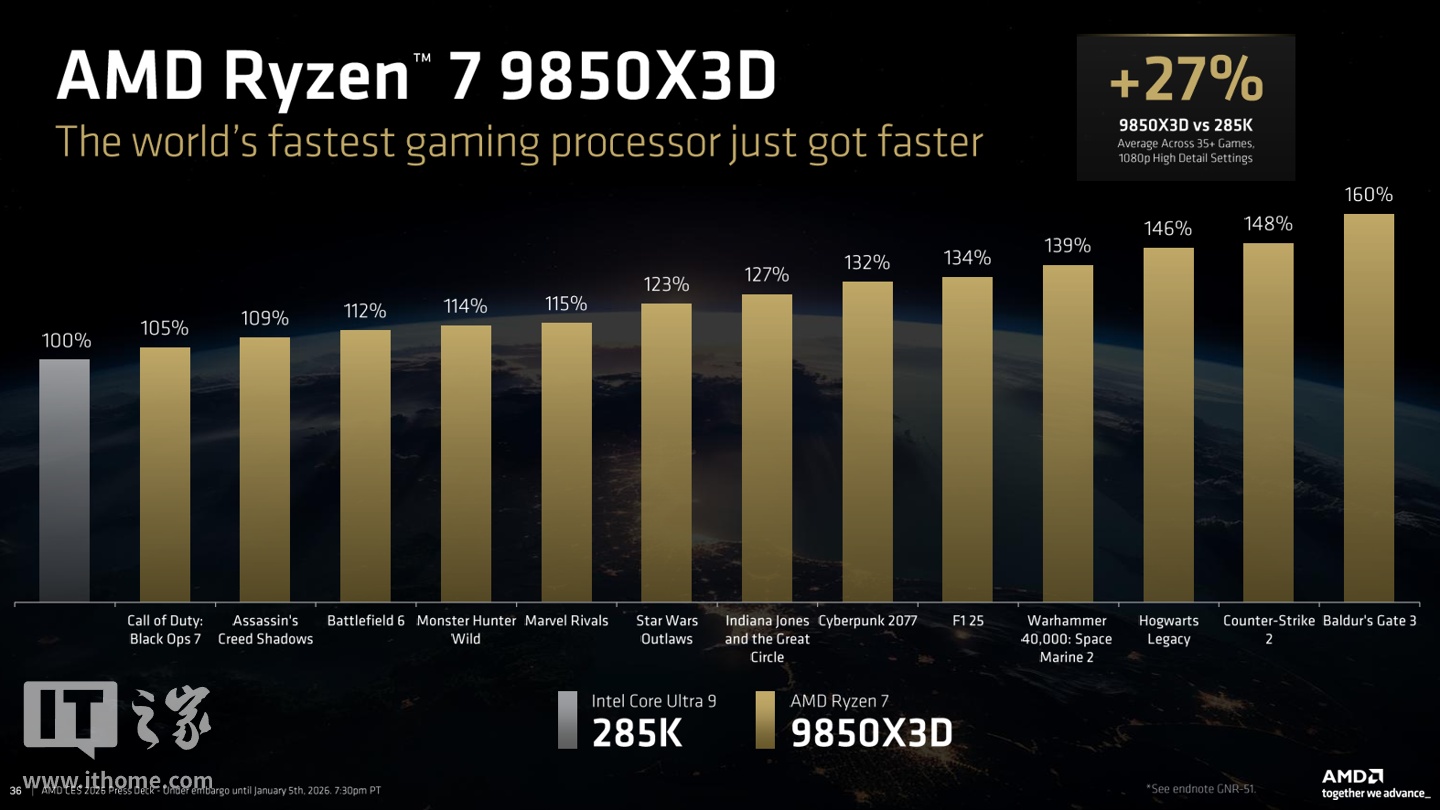Ryzen 7 9850X3D 宣称相比英特尔酷睿 Ultra 9 285K 的平均游戏性能强 27%(1080P 高画质),《博德之门 3》的游戏表现强 60%。