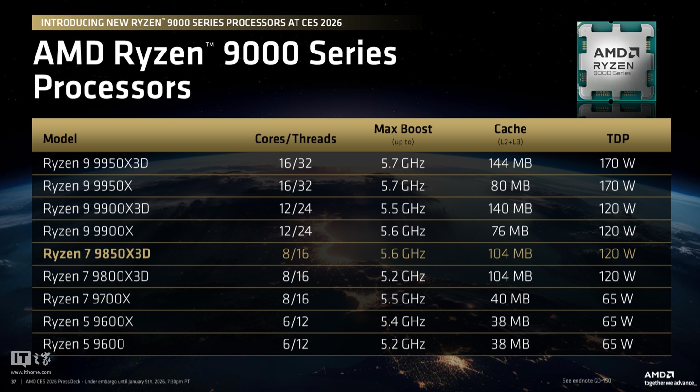 IT之家 1 月 6 日消息,AMD 今日正式发布 Ryzen 7 9850X3D,最强游戏处理器迎来升级,这是一款基于 Zen 5 架构的桌面处理器,拥有 8 核 16 线程,配备 96MB 的 L3 缓存,其中包括 64MB 的堆叠 3D V-Cache。