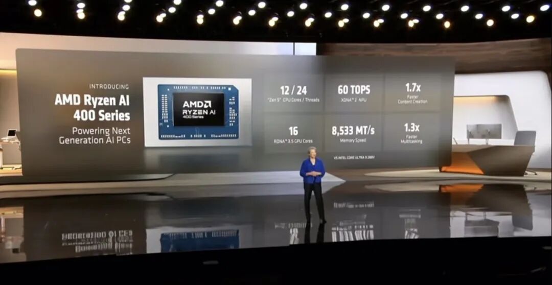 Ryzen AI 400系列处理器是业界最广泛和最先进的AI PC处理器系列,搭载了12颗Zen 5核心,最高支持3.1 GHz RDNA3.5和60 TOPS NPU。