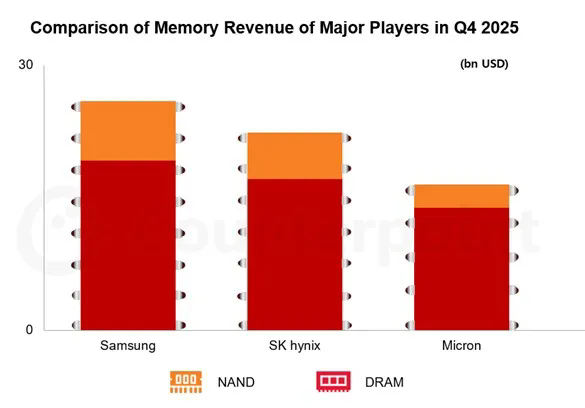 根据市场研究公司Counterpoint Research于1月8日发布的数据,三星去年第四季度从其存储半导体业务中获得了259亿美元的营收,较上一季度增长34%。存储半导体预计将占三星总营收(约93万亿韩元)的40%左右。其中,DRAM营收为192亿美元,NAND营收为67亿美元。同期,SK海力士的总存储营收为224亿美元,其中DRAM为171亿美元,NAND为53亿美元。
