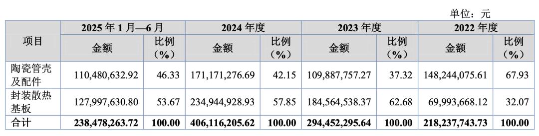 其中,公司的第一大业务曾发生变化。报告期内,陶瓷管壳及配件业务的营收分别约为1.48亿元、1.1亿元、1.71亿元及1.1亿元,占主营业务收入的占比从67.93%降至46.33%。