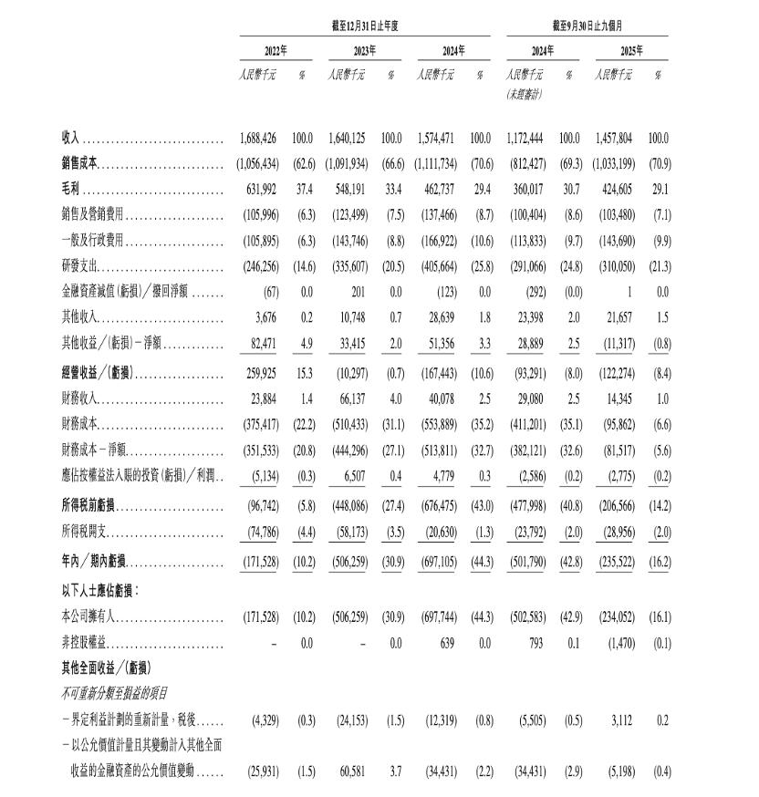 同期,其分别亏损1.72亿元、5.06亿元、6.97亿元及5.02亿元。2025年1-9月,该公司实现收入14.58亿元,净亏损2.36亿元。