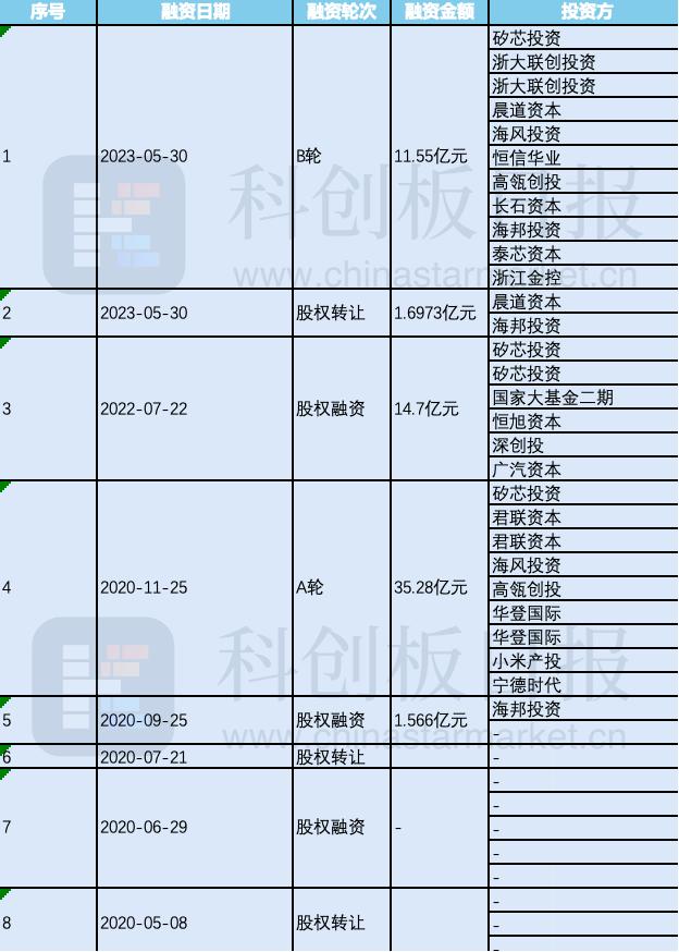 2023年5月,该公司完成B轮融资与部分股权转让。其中B轮融资金额为11.55亿元,投资方包括浙大联创投资、晨道资本、海邦投资等。
