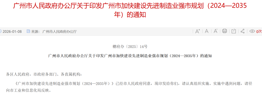 1月8日,广州市人民政府办公厅发布《广州市加快建设先进制造业强市规划(2024—2035年)》(以下简称《规划》),目标到2030年,先进制造业强市建设迈上重要台阶,现代化产业体系建设取得显著进展,产业体系整体效能明显提升,形成万亿带动、千亿支撑、百亿跃升的新格局。