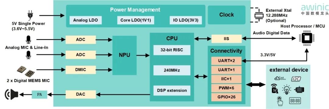 AWA89601芯片的核心创新在于搭载了端侧NPU,内集成音频专用NPU提供端侧推理算力,支持实时处理4路上行语音。相比云端方案,这种集成电路设计实现了数据本地处理,有效避免隐私泄露,同时实现低延时响应,无需依赖网络连接。